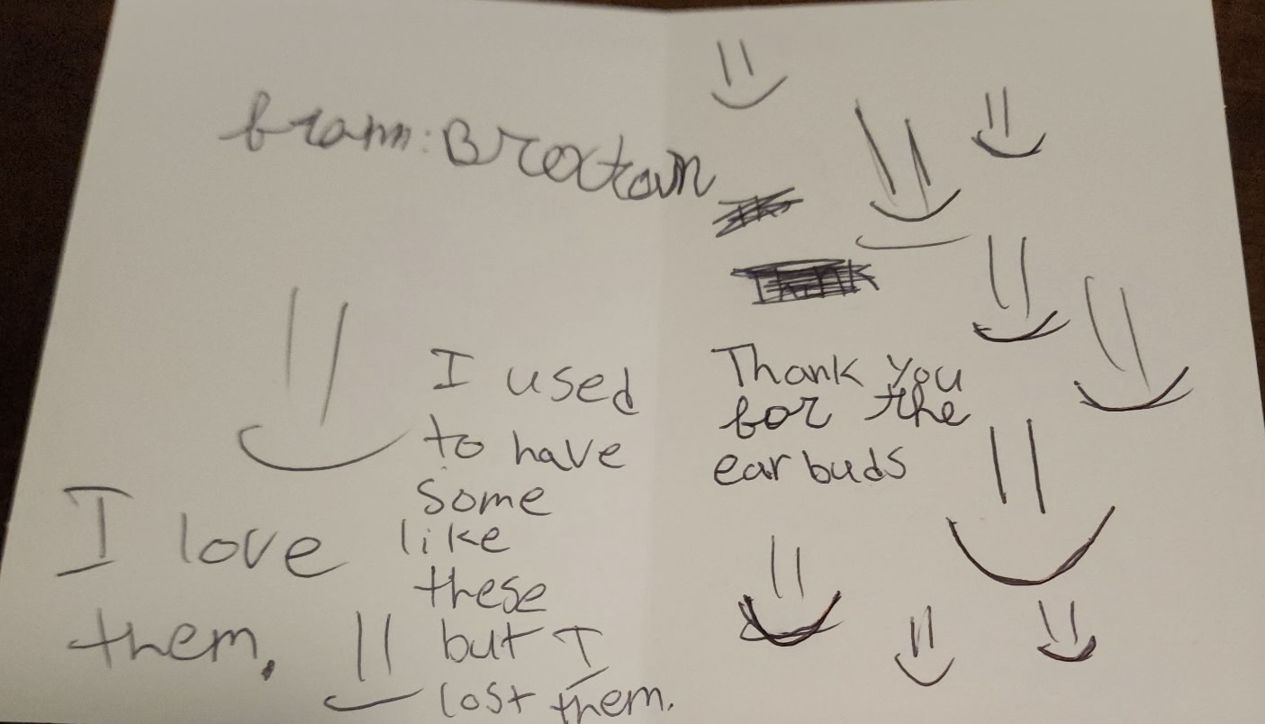 "Hope you like your new earbuds! I have ADHD too — I know it can be hard to concentrate sometimes. Wishing you every good and wonderful thing, Brexton. "